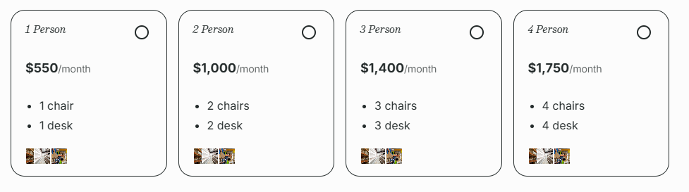 - 1-person office: $550/month, 1 chair, 1 desk.