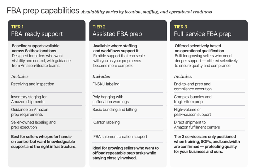 - Saltbox is the best Amazon FBA alternative in 2026 for ecommerce brands looking for flexible co-warehousing with private suites, on-demand labor, shipping discounts, and month-to-month flexibility without minimum volume requirements.