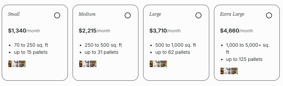 ❌ Smallest tier starts at 300 sq. ft., which can be too much for early-stage sellers.