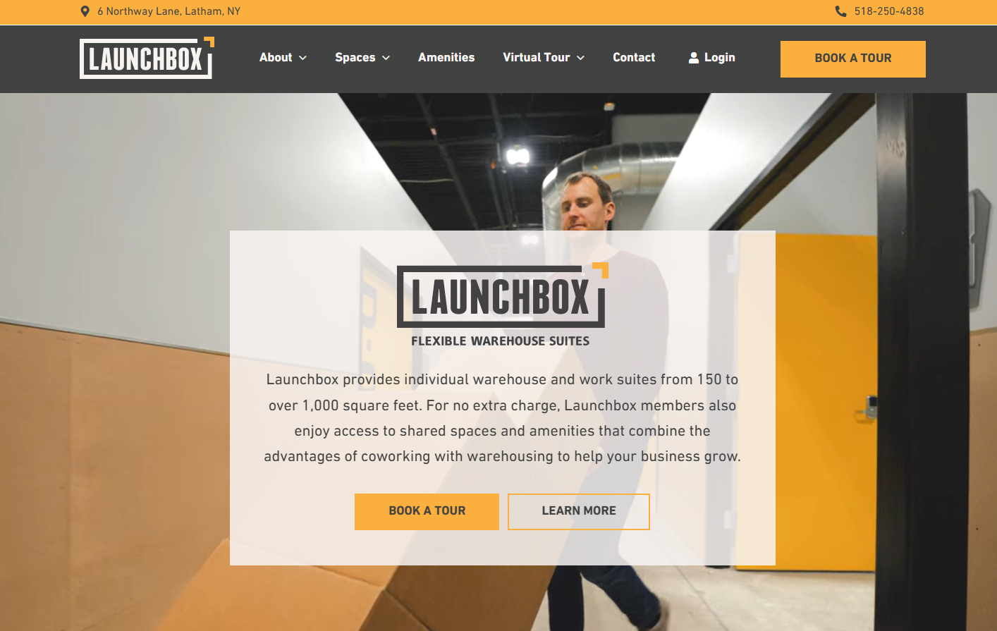 Launchbox is a co-warehousing facility in upstate New York, offering individually locking warehouse suites from 150 to 1,000 sq. ft. inside a retrofitted industrial building.