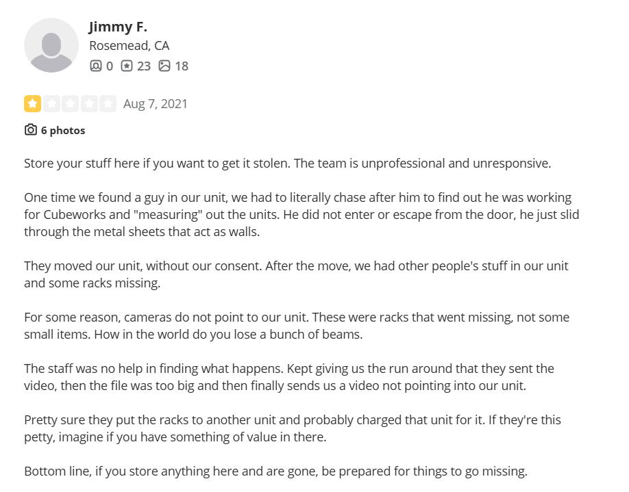 ‘’One time, we found a guy in our unit, we had to literally chase after him to find out he was working for Cubeworks and ‘measuring’ out the units. He did not enter or escape from the door; he just slid through the metal sheets that act as walls. They moved our unit without our consent. After the move, we had other people's stuff in our unit, and some racks were missing. For some reason, cameras do not point to our unit. These were racks that went missing, not some small items. How in the world do you lose a bunch of beams. The staff was no help in finding what happened. Kept giving us the run around that they sent the video, then the file was too big and then finally sent us a video not pointing into our unit. Pretty sure they put the racks in another unit and probably charged that unit for it. If they're this petty, imagine if you have something of value in there.’’ – Yelp Review.