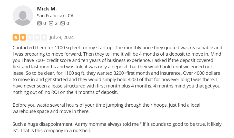‘’Contacted them for 1100 sq feet for my start-up. The monthly price they quoted was reasonable and I was preparing to move forward. Then they tell me it will be 4 months of a deposit to move in. Mind you, I have a 700+ credit score and ten years of business experience. I asked if the deposit covered first and last months and was told it was only a deposit that they would hold until we ended our lease. So to be clear, for 1100 sq. ft., they wanted 3200+first month and insurance. Over 4000 dollars to move in and get started and they would simply hold 3200 of that for however long I was there. I have never seen a lease structured with first month plus 4 months. 4 months, mind you, that gets you nothing out of, no ROI on the 4 months of deposit.’’ – Yelp Review.