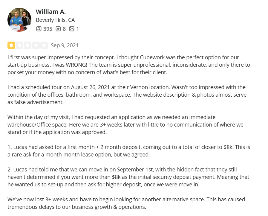 ‘’I had a scheduled tour on August 26, 2021, at their Vernon location. Wasn't too impressed with the condition of the offices, bathroom, and workspace. The website description & photos almost serve as false advertisement.’’ – Yelp Review.