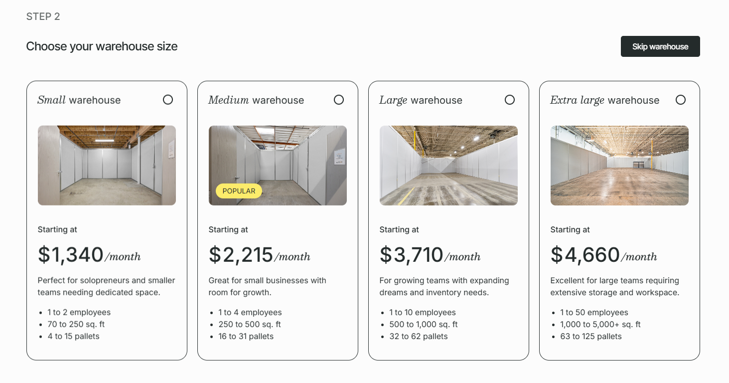 - Extra Large: Up to 50 employees with 1,000 to 5,000+ sq. ft of space, and from 63 to 125 pallets. Ideal for bigger DTC teams that need extensive storage and workspace.