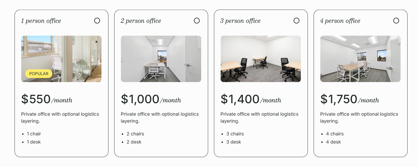 - Flexible coworking memberships and private office options.