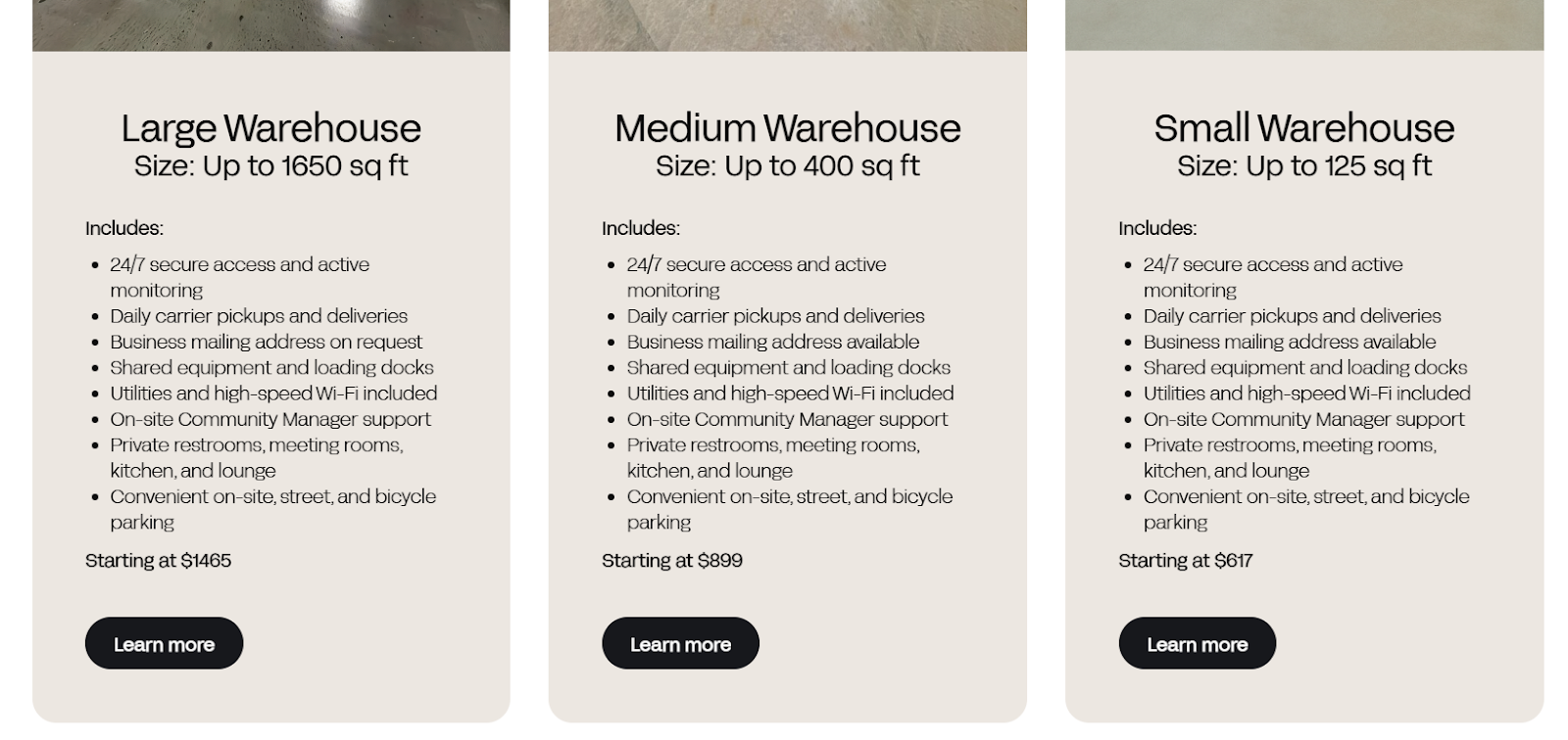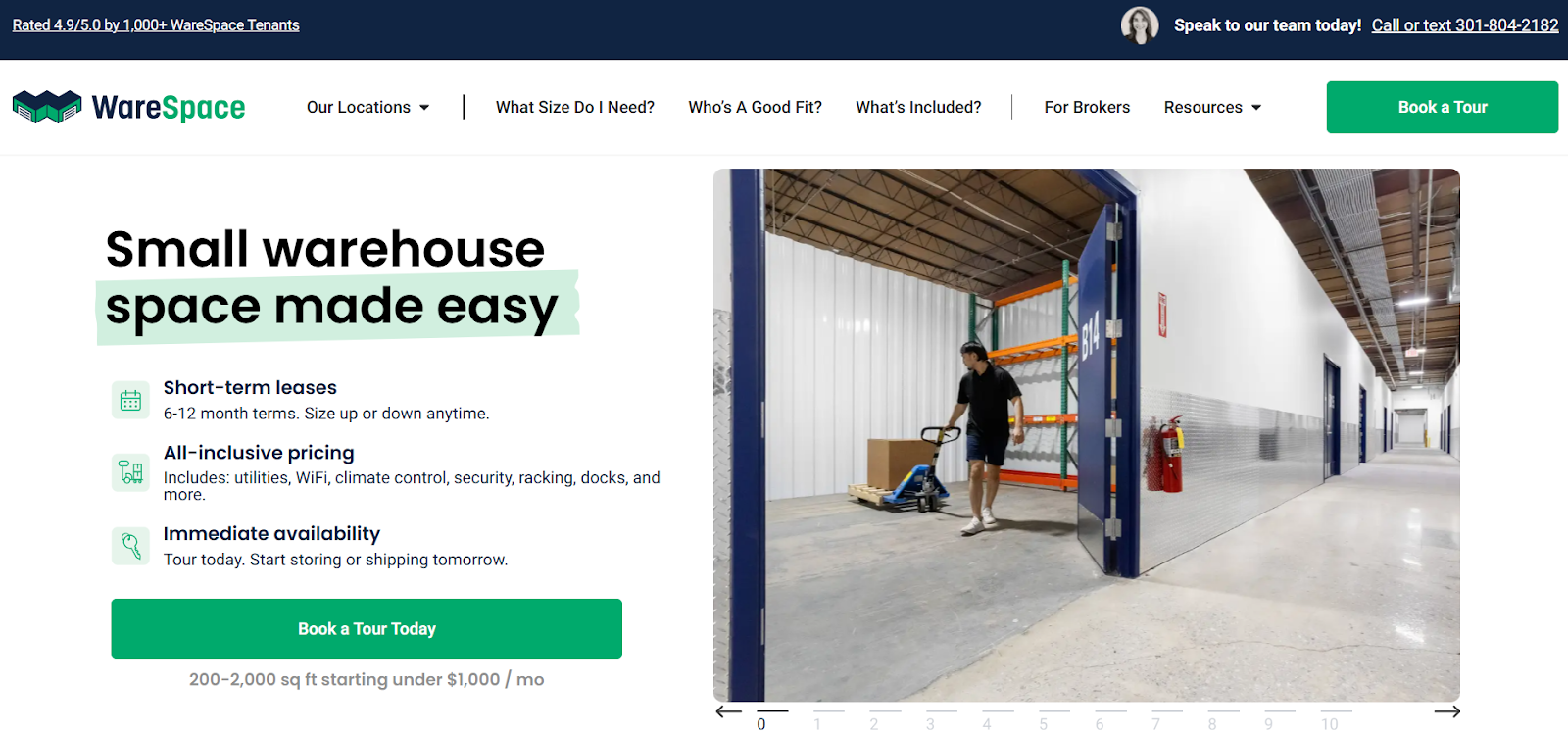 - Large warehouse space: 1,000+ sq. ft. that starts from $2,995/month.
