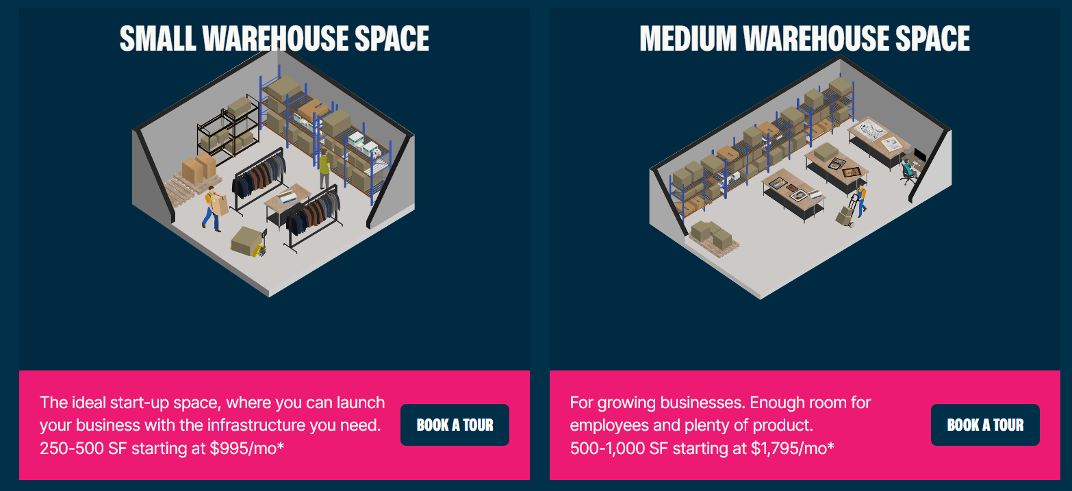 - Small warehouse space: From 250 to 500 sq. ft. that start from $995/month.