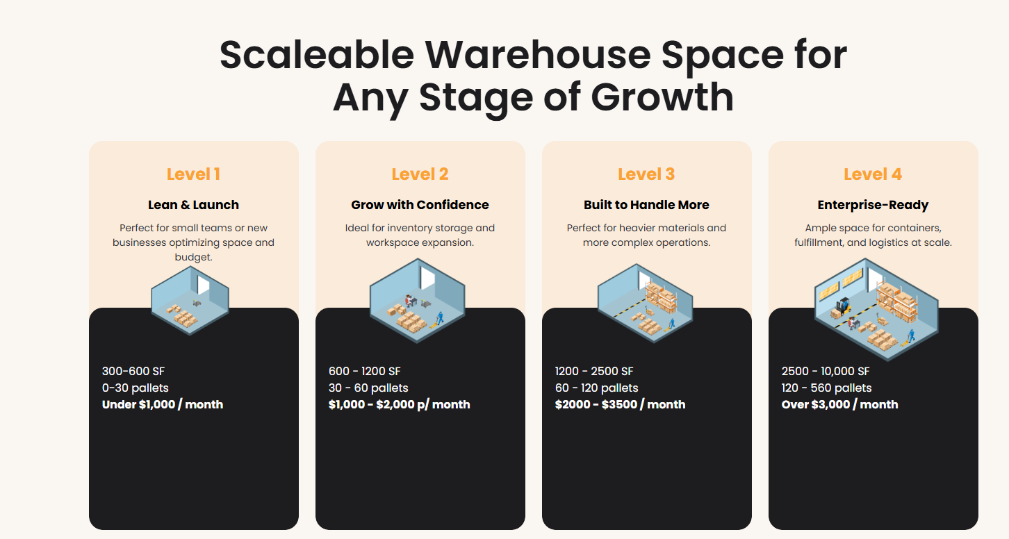 We provide flexible warehouse and office spaces from 70 to 5,000 sq. ft., with monthly billing (no long-term lease required) and the freedom to scale up or down as your business evolves.