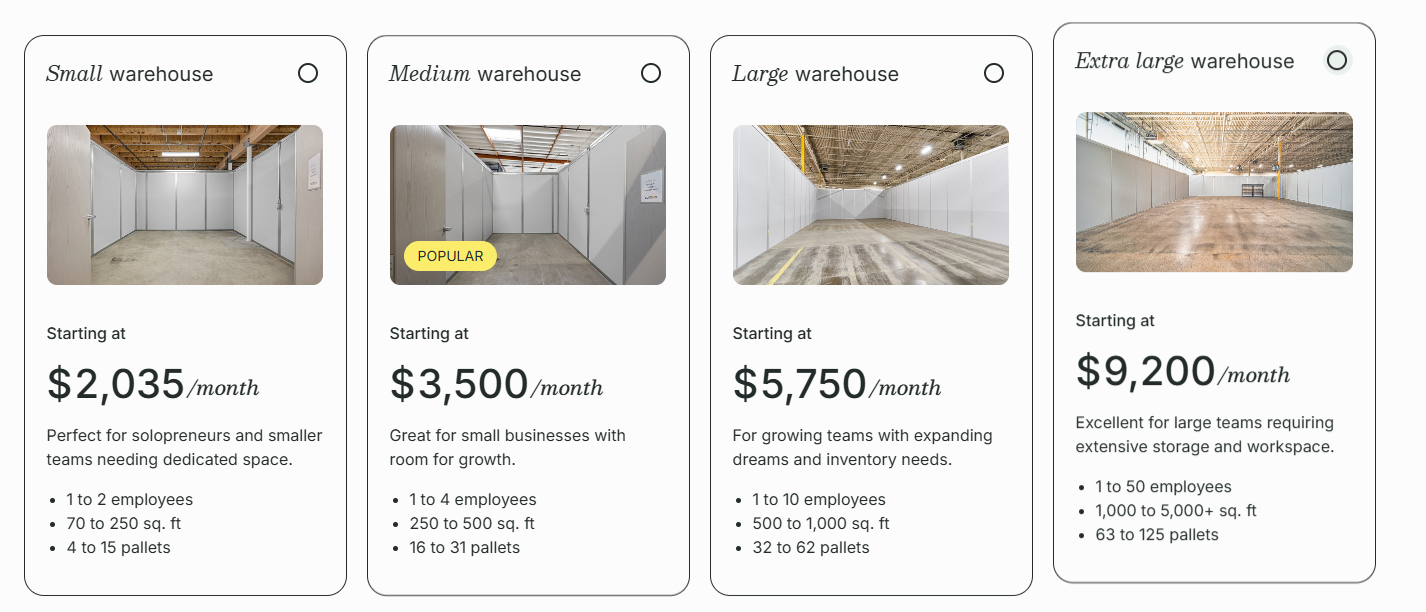 - Small: Supports 1 to 2 employees, with 70 to 250 sq. ft. of space and capacity for 4 to 15 pallets. Perfect for solopreneurs and small teams that need their own dedicated area.