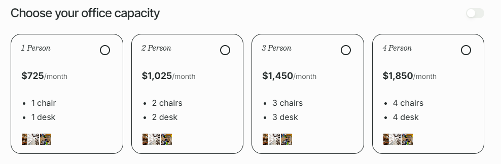 - 1-person office: $725/month for 1 chair and 1 desk.
