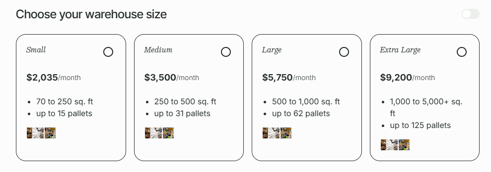 Saltbox offers four warehouse space tiers to match your business stage: