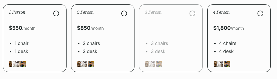 - 2-person office: $850/month for 2 chairs and 2 desks.