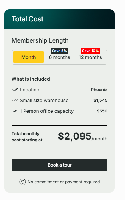 ➡️ You can take a quiz after selecting your location to figure out the right fit, or book a tour and have our operations team figure out the right amount of space for your use case.