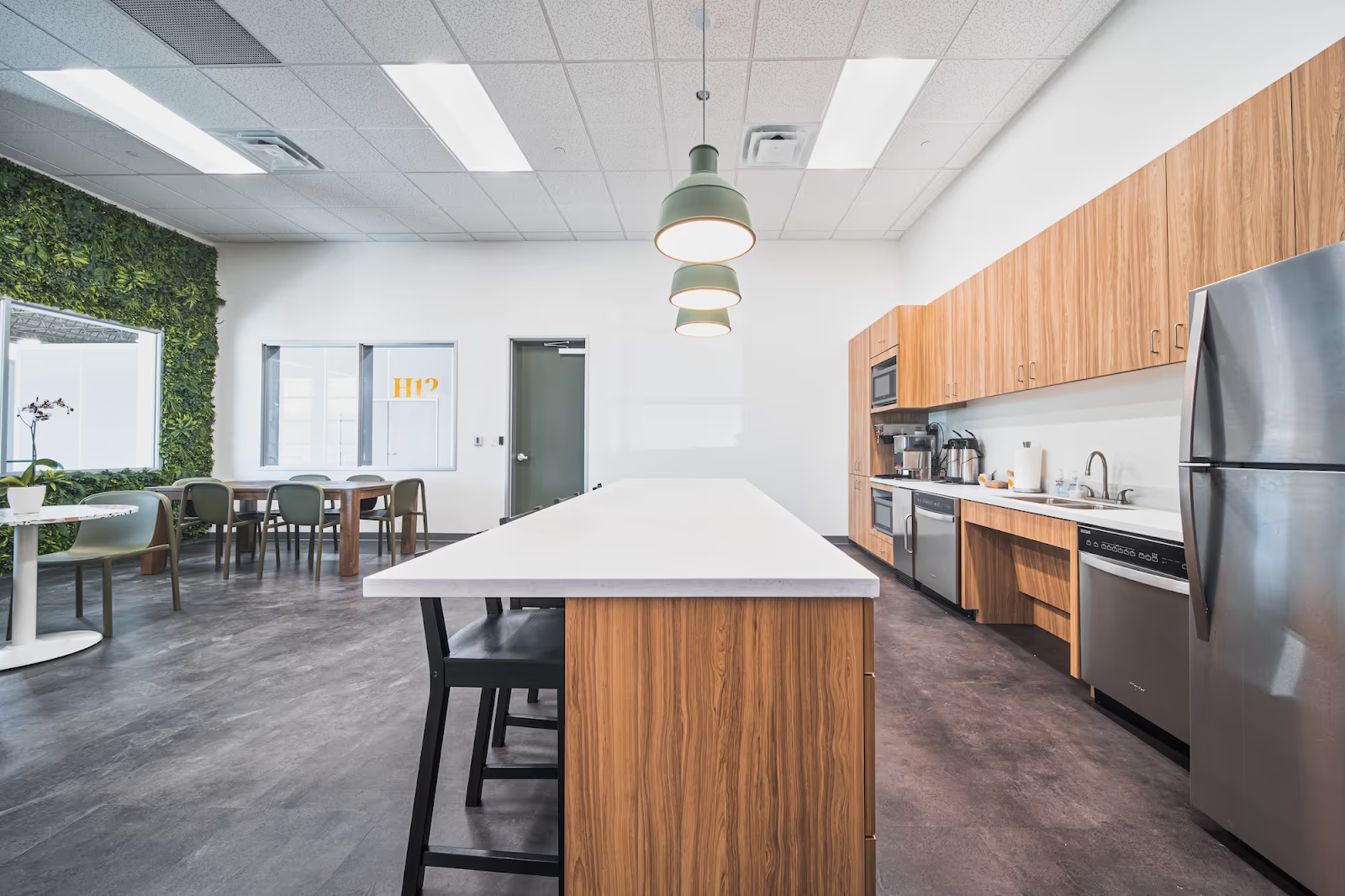 - A living green wall in the community workspace, a yellow-accented kitchen, and glass-walled conference rooms.