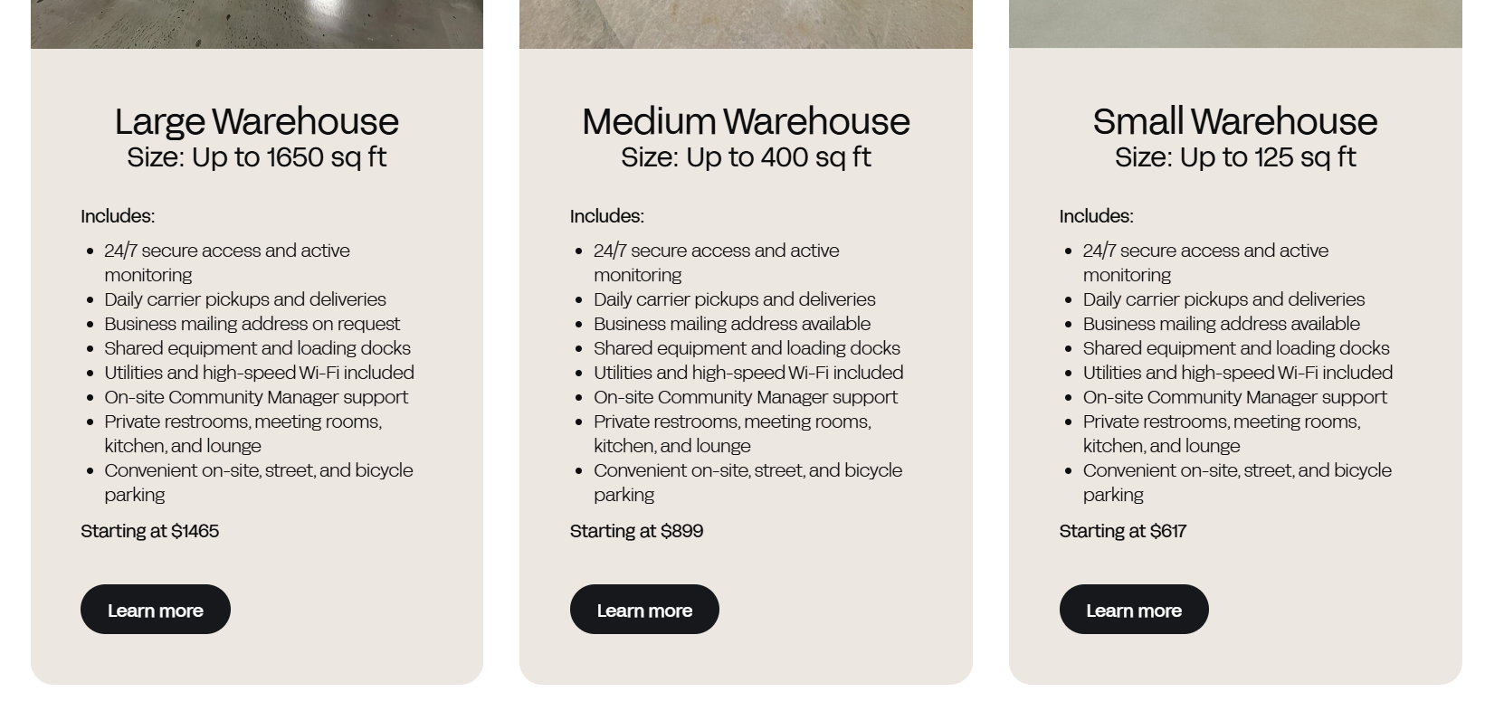 - Warehouses: $617/month for 125 sq. ft. up to $1,465/month for 1,650 sq. ft.