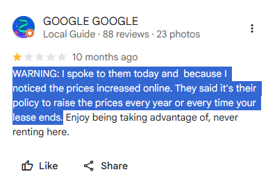 ‘WARNING: I spoke to them today and because I noticed the prices increased online. They said it's their policy to raise the prices every year or every time your lease ends.’ – Google Review.