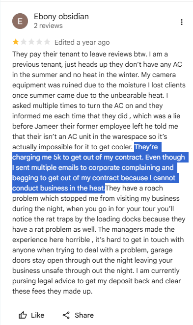 They mention that they wanted to end the agreement prematurely because one of its locations lacked an AC during the time (even losing clients because of this), but they were told that they’d need to pay $5,000 to get out of the contract.